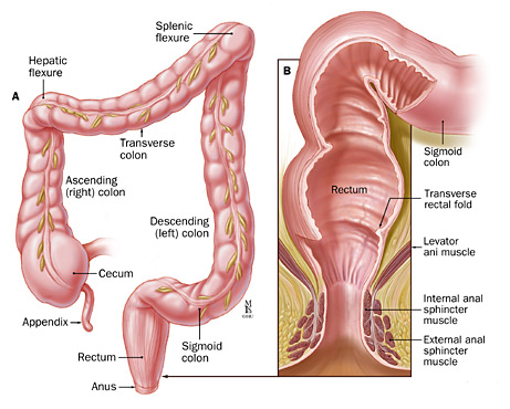 Los primeros 180 cm del intestino grueso se llama colon, mientras que los últimos 15 cm constituyen el recto y el conducto anal.